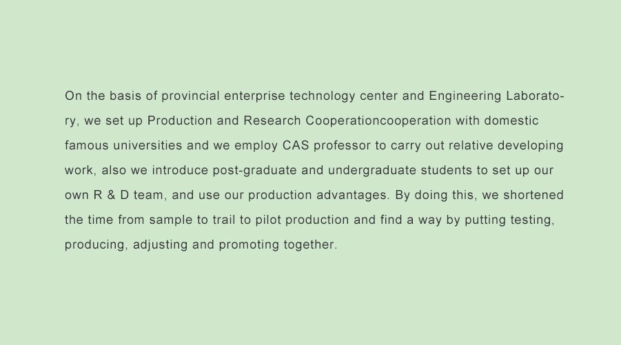 On the basis of provincial enterprise technology center and Engineering Laboratory, we set up Production and Research Cooperation cooperation with domestic famous universities and we employ CAS professor to carry out relative developing work, also we introduce post-graduate and undergraduate students to set up our own R & D team, and use our production advantages. By doing this, we shortened the time from sample to trail to pilot production and find a way by putting testing, producing, adjusting and promoting together.